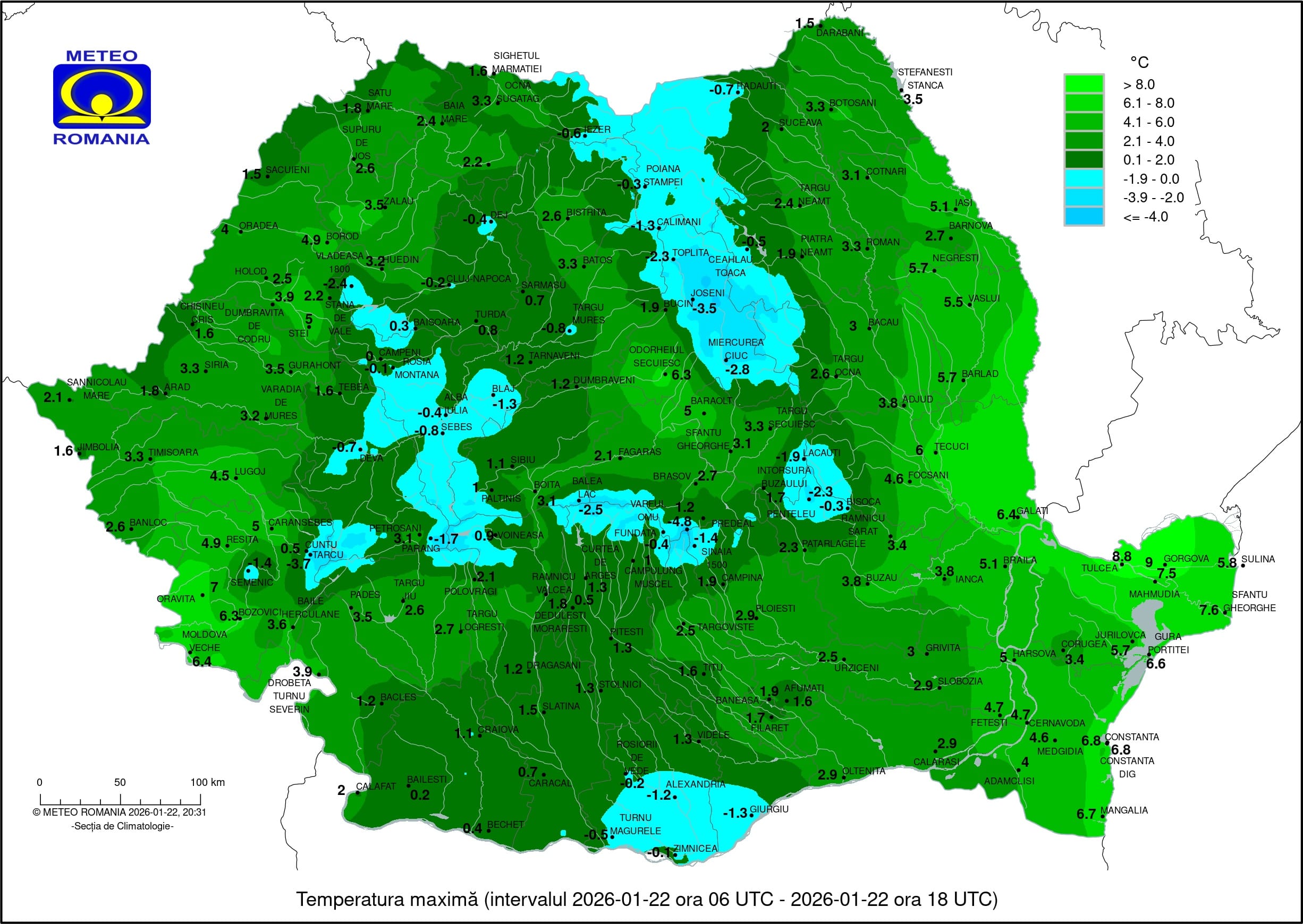 Atunci cand privim harta valorilor maxime, pare greu de crezut ca la inceputul acestei saptamani discutam de valori sub -20 de grade pe timpul noptii in anumite regiuni, iar acum discutam de valori de primavara in Dobrogea. Daca adaugam si efectul ploilor si al zapezilor care topeste, tabloul e complet.