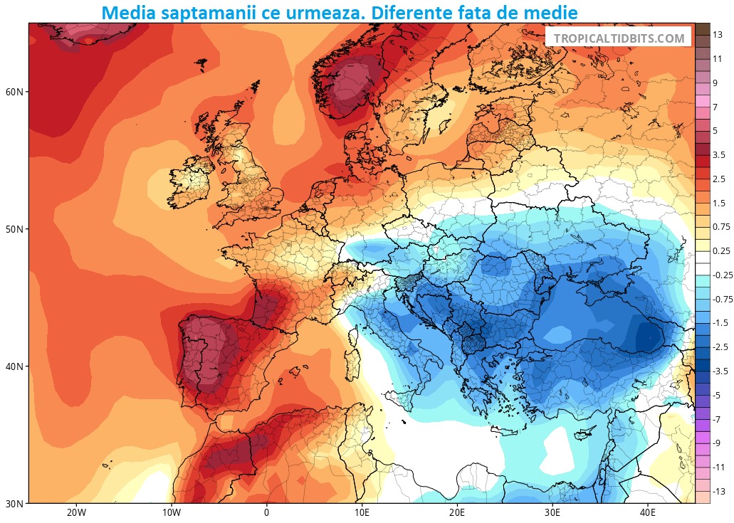 Pentru Europa de Est, anticiclonul de blocaj oceanic aduce o antrenare de aer dinspre Marea Nordului. Acesta nu este la fel de rece precum cel antrenat de anticiclonul groenlandez sau de anticiclonul est-european (masa de aer foarte rece sosita la final de Septembrie).Astfel, ne asteptam ca circulatia din saptamana ce urmeaza sa fie formata dintr-o alternanta de mase de aer mai caldute sau mai racoroase.Din pacate, pozitia anticiclonului este mult prea estica, iar forma sa nu permite antrenarea aerului rece in mediterana cel putin pe moment.