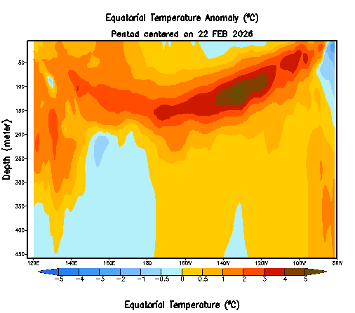 În a doua imagine putem observa dezvoltarea unui val Kelvin cald. Fenomenul a avut loc pe parcursul lunilor Ianuarie și Februarie, fiind de obicei un precursor al fenomenului El Nino, însă acesta nu este singura condiție.