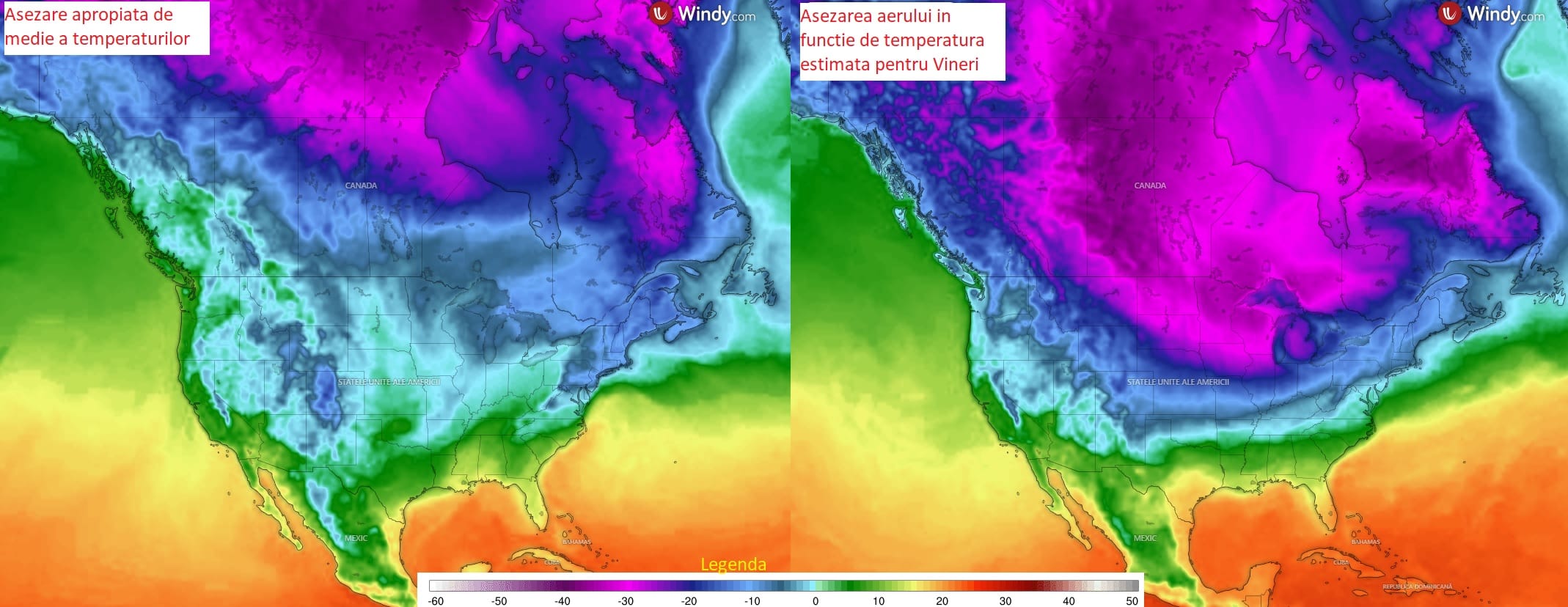 O masa de aer foarte rece a inceput sa coboare in aceste zile dinspre Canada, urmand sa traverseze lent teritoriul Statelor Unite ale Americii. Acest aer acumulat avanseaza foarte mult spre sud fata de normal, asa cum vedem si in imaginea de mai sus.