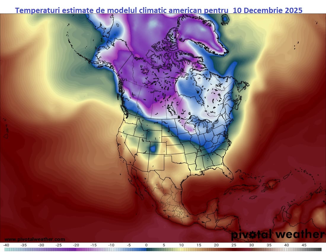 Aerul foarte rece va continua sa domine Canada, asa cum putem vedea si in imaginea atasata, iar prin aceasta circulatie, va continua sa fie prezent in zona de Nord a Statelor Unite. Modelarea climatica american estimeaza ca acesta se va retrage spre Nord abia dupa perioada Craciunului. In tot acest timp vor mai fi usoare patrunderi reci spre Sud, in zona statelor nordice, iar acestea vor alterna cu perioade foarte calde. Modelarea se desfasoara cu dificultate, iar incertitudinea e dificil de depasit. Cu siguranta ca inghetarea Golfului Hudson ar trebui sa aduca o stabilitate mai pronuntata in zona continentului american.