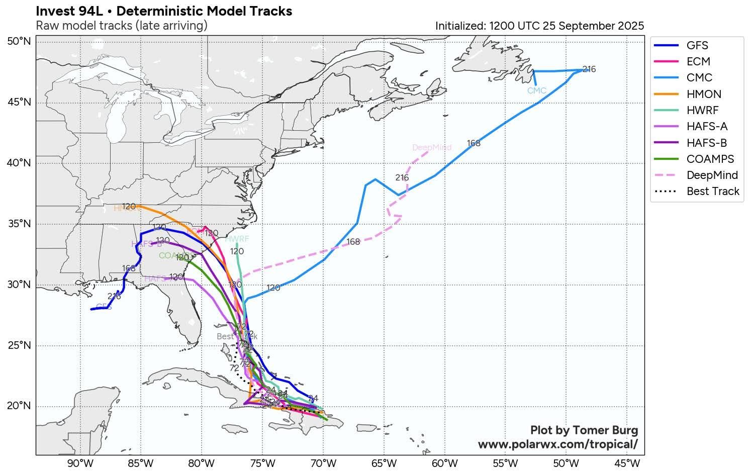 In imaginea atasata, putem vedea foarte clar traiectoria cu culoarea roz a modelului Google, iar rezultatul este unul foarte bun : Imelda nu va lovi SUA, fiind deviata de uraganul Humberto. Tinand cont ca este pentru prima data in istoria masurata cand un uragan evita SUA datorita efectului altui uragan, am zice ca performanta este una chiar remarcabila.