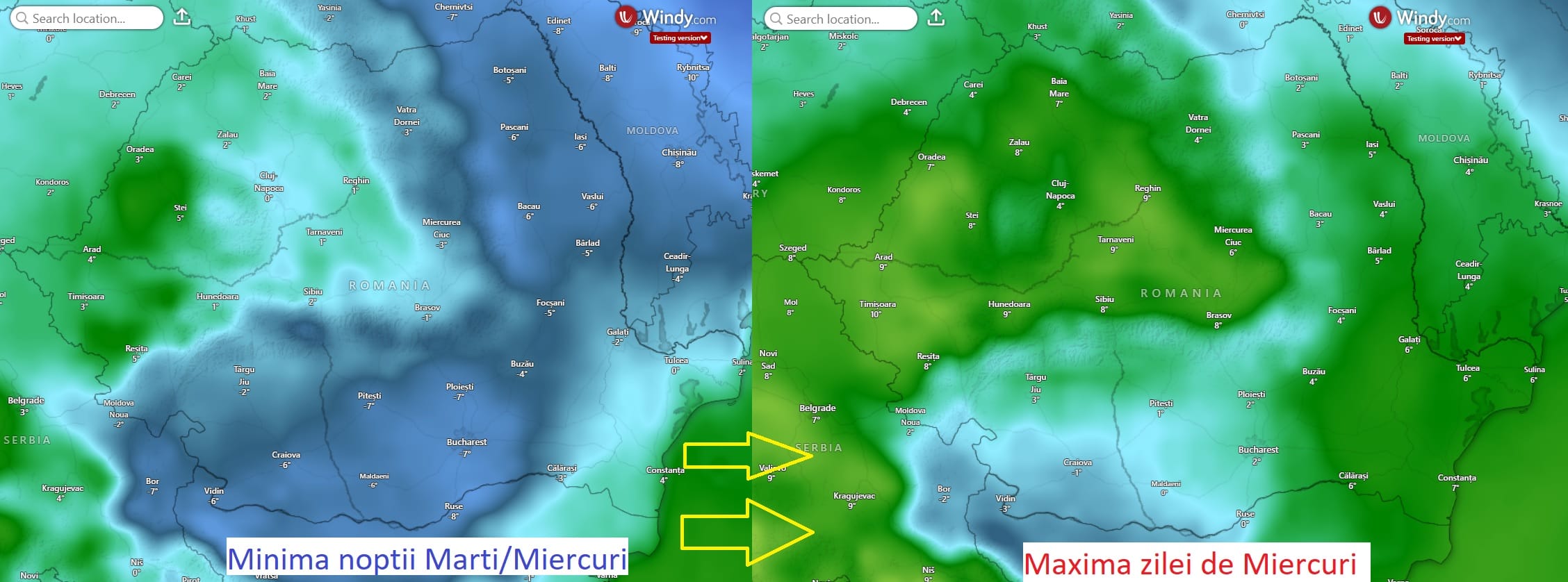 Vremea va intra intr-un proces puternic de incalzire, despre care am discutat in ultimele articole. Temperaturile vor deveni pozitive pe parcursul zilei de maine in majoritatea regiunilor, iar masa de aer rece va fi ventilata din zona tarii noastre. Valorile temperaturii vor ramane pozitive si pe parcursul noptilor, urmand sa duca la o topire accelerata a zapezii depuse.Saltul temperaturii este unul destul de pronuntat, asa cum putem vedea si in imaginea de mai sus. Temperaturile trec de la valori aflate la 4-5 grade sub medie, la valori aflate usor peste normalul perioadei.
