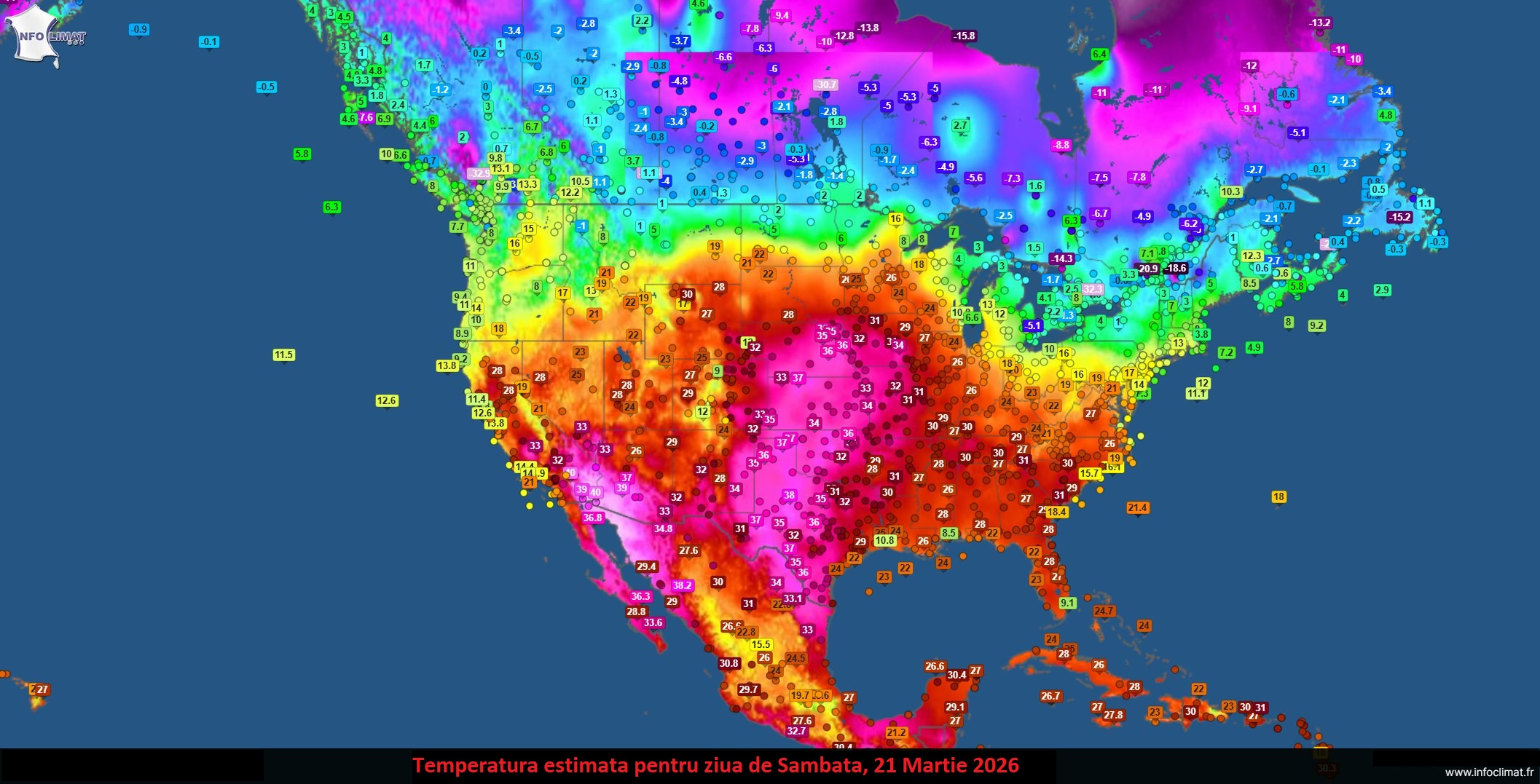 Temperaturi inregistrate in zona Americii de Nord in ziua de Sambata, 21 Martie 2026SURSA: Infoclimat.fr