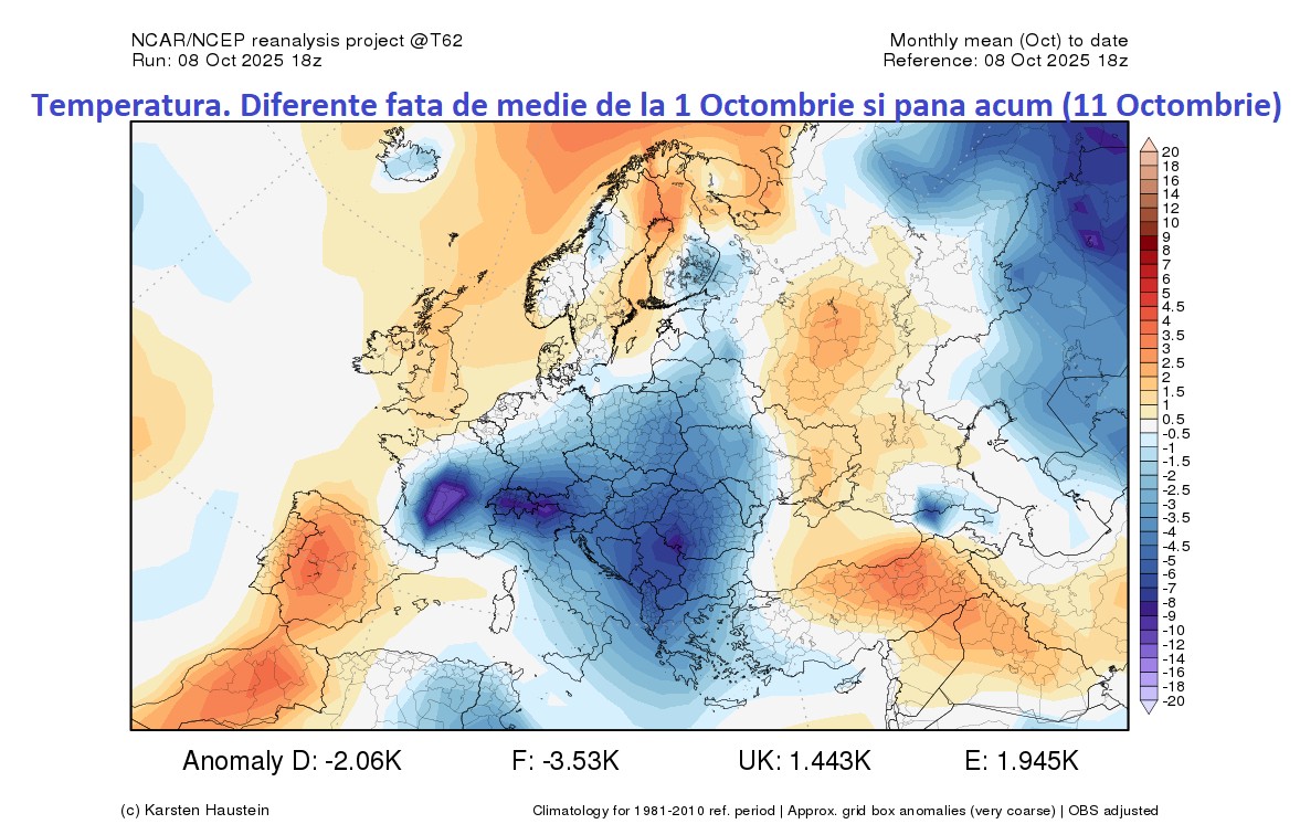 In acest moment, Octombrie 2025 este a 4 a cea mai rece luna Octombrie din ultimii 25 de ani. Cu o temperatura medie de 8,8 grade, actuala perioada din Octombrie este depasita doar de Octombrie 2016, 2003 si 2010.