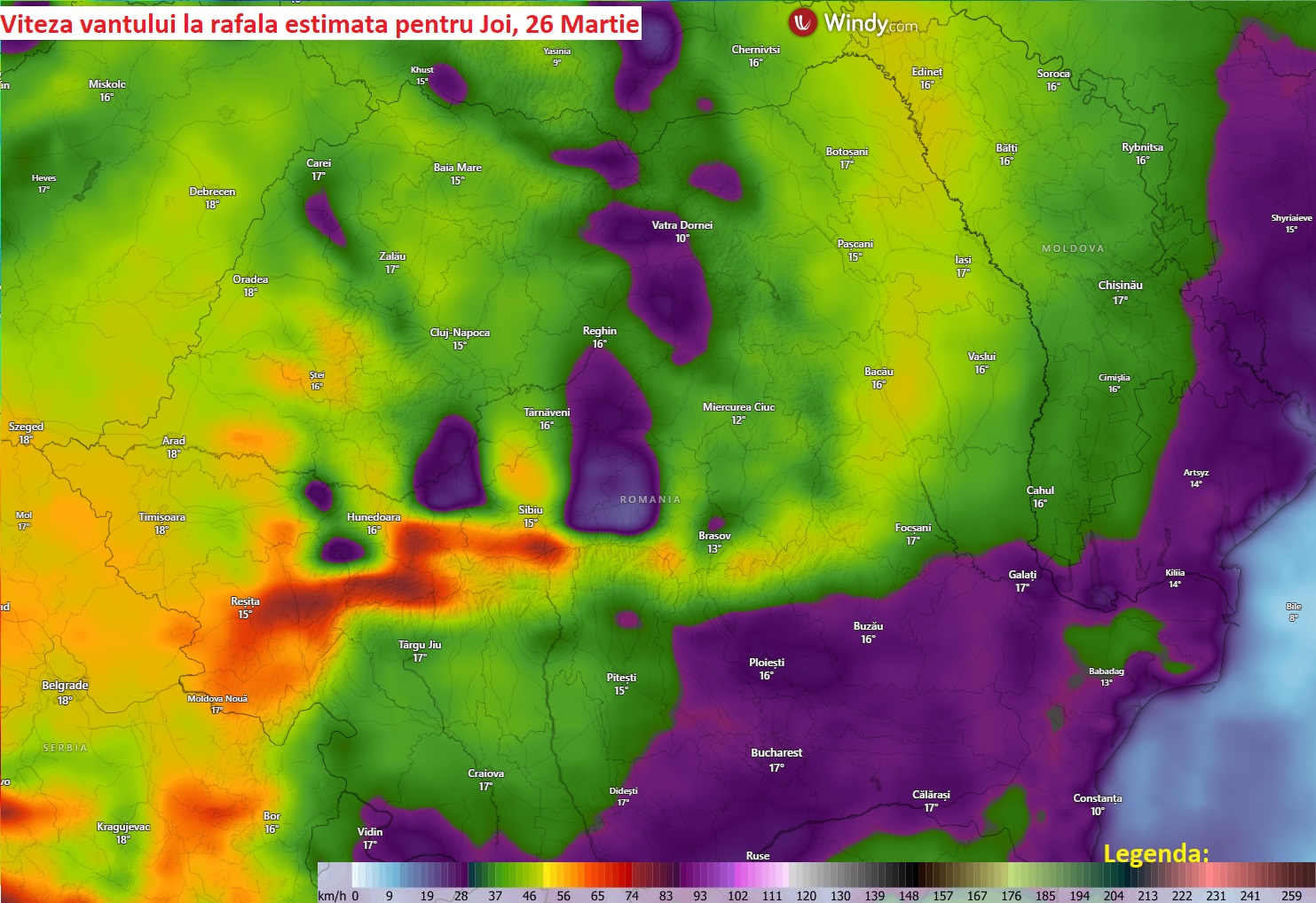 Viteza vantului la rafala estimata pentru Joi, 26 Martie 2026SURSA: Windy