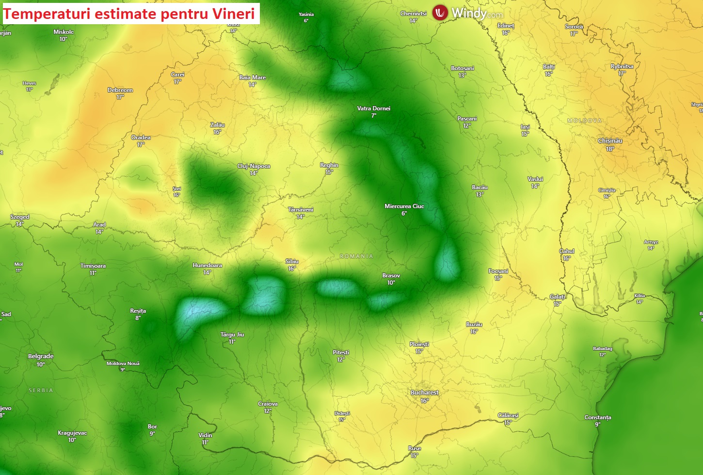Ziua de Sâmbătă va aduce o scădere cu câteva grade a temperaturilor. Maximele se vor opri la 12-14 grade în zonele de câmpie. Valori ceva mai ridicate vor fi în regiunile nordice, unde aerul cald va fi încă prezent. Astfel, la Iași așteptăm valori de 17-18 grade și la fel și în nord-vest.